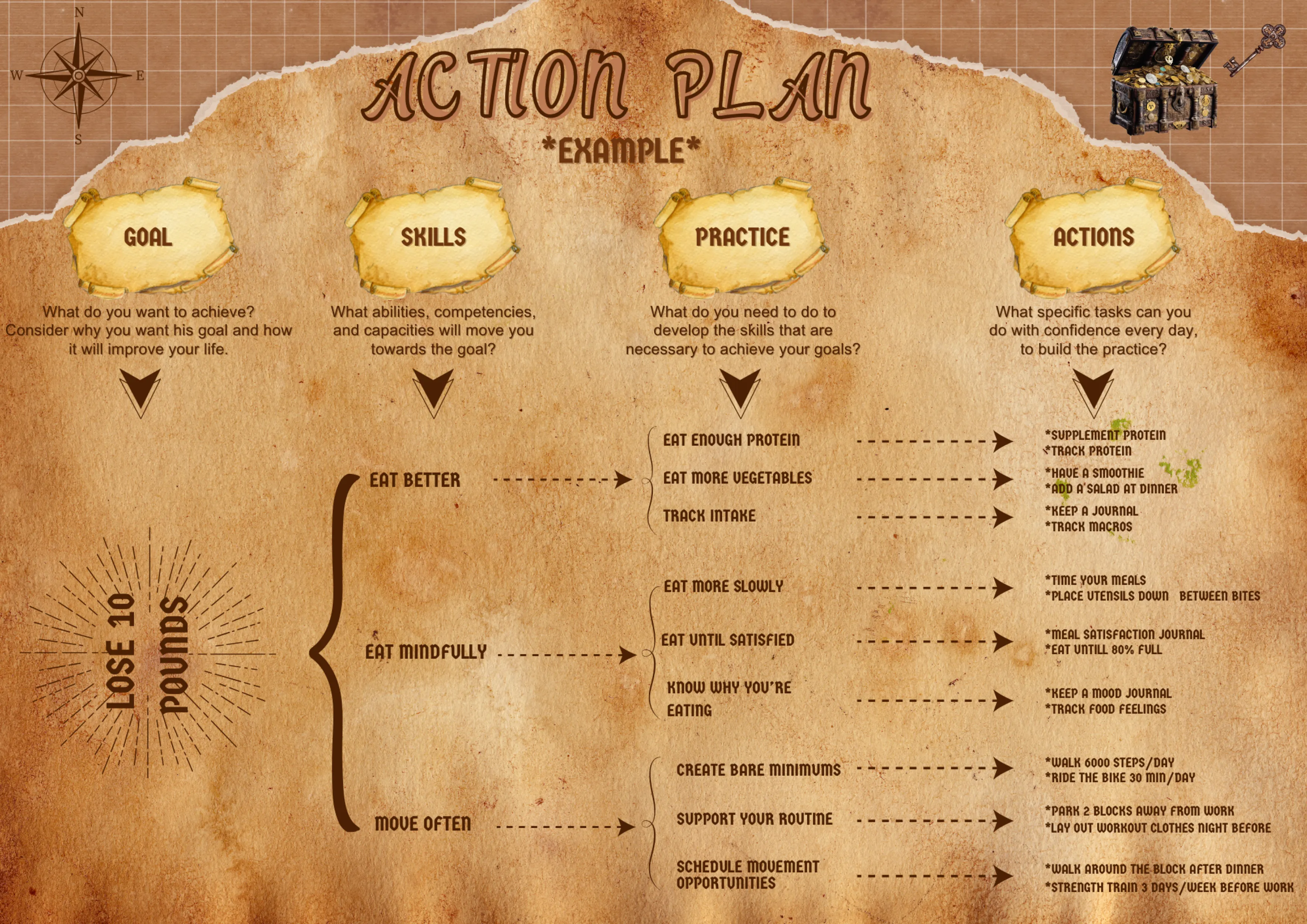 Once you’ve defined your goal, identify the skills required to achieve it. Let’s stick with the example of losing 10 pounds. To reach that goal, you might need skills like: